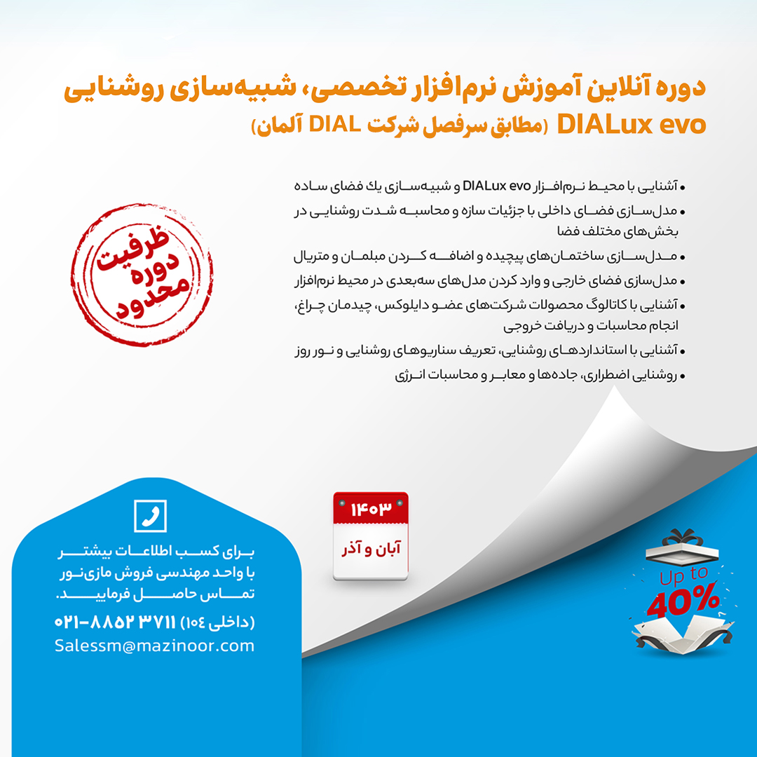 دوره آنلاین آموزشی DIALux evo به همت شرکت صنایع روشنایی مازینور در آذر و آبان ۱۴۰۳، مطابق با سرفصلهای شرکت DIAL آلمان برگزار خواهد شد.